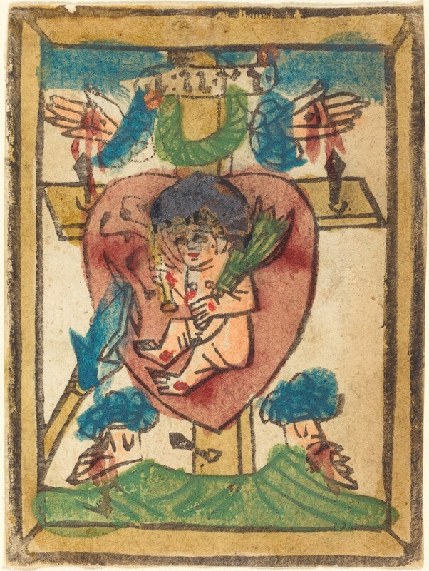 Therefore, dearest, we send you, in true love, a little devotional leaf, wherein you will find painted the blessed, sweet, divine heart of our dear Saviour, which he let be opened for love of us with the sharp spear; and within this little heart sits the most beautiful, most desirable little child Jesus, who may grant you through his holy humanity a new, joyful, healthy, blessed year; and everything you desire, both for body and for soul, so that you may draw from his honey-flowing heart the heavenly influx of his divine grace and sweetness, so fully that you might be completely intoxicated by it.